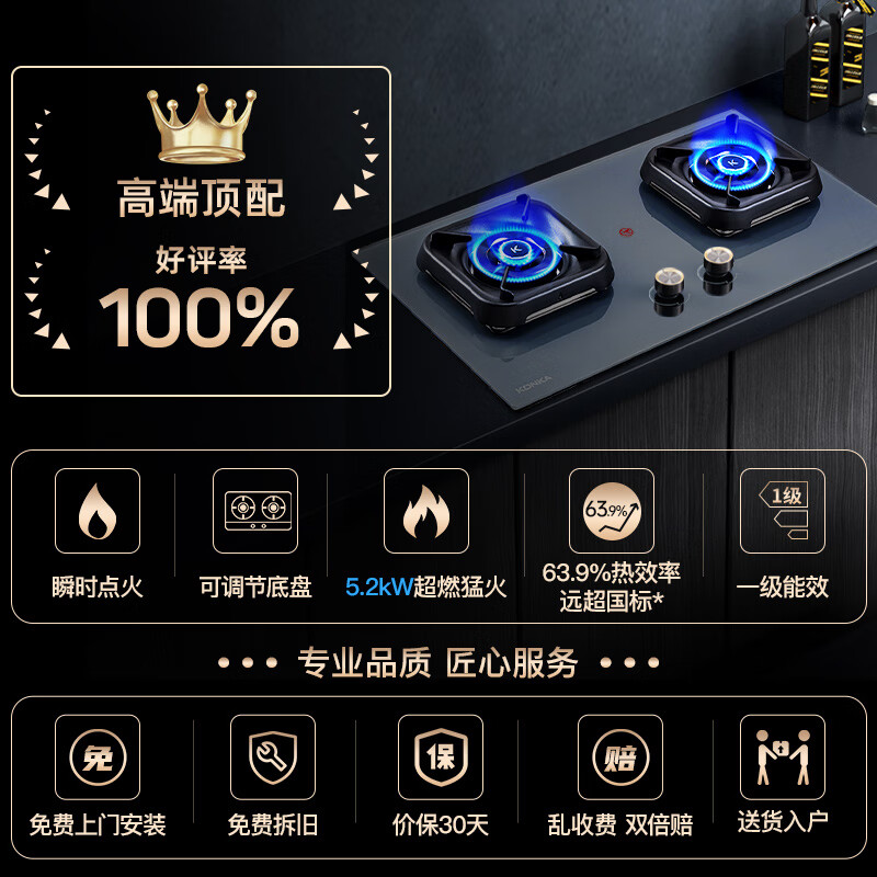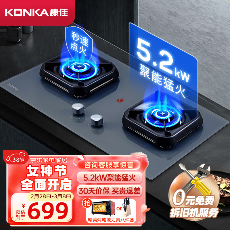 康佳(KONKA)燃气灶双灶具 家用5.2kW大火力煤气灶 秒速点火 聚能防风 台嵌两用猛火灶 JZY-B522X(液化气)价格:699.00元!