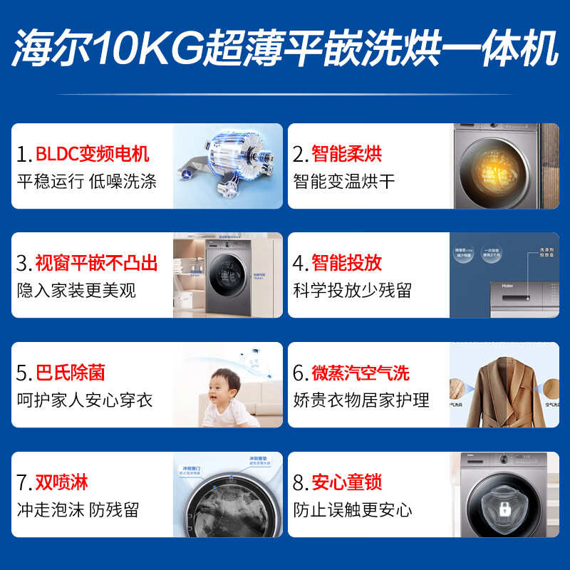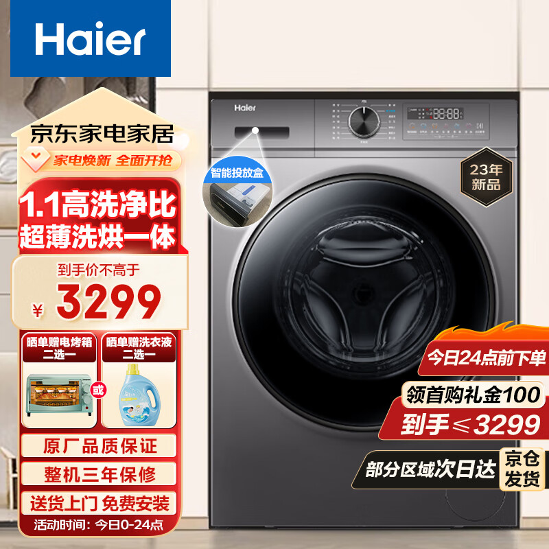 海尔(Haier)10KG滚筒洗衣机全自动家用大容量智能变频一级能效羽绒洗1.1高洗净比+洗烘一体XQG100-HBD1216价格:3399.00元!