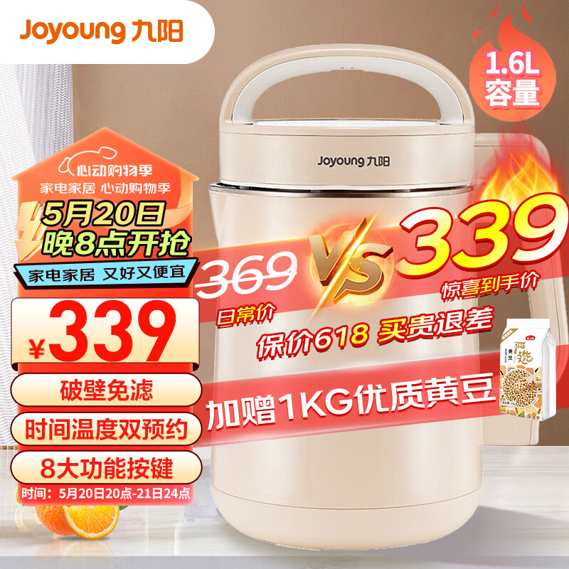 九阳(Joyoung)豆浆机1.3-1.6L破壁免滤大容量智能双预约全自动榨汁机料理机价格:339.00元!