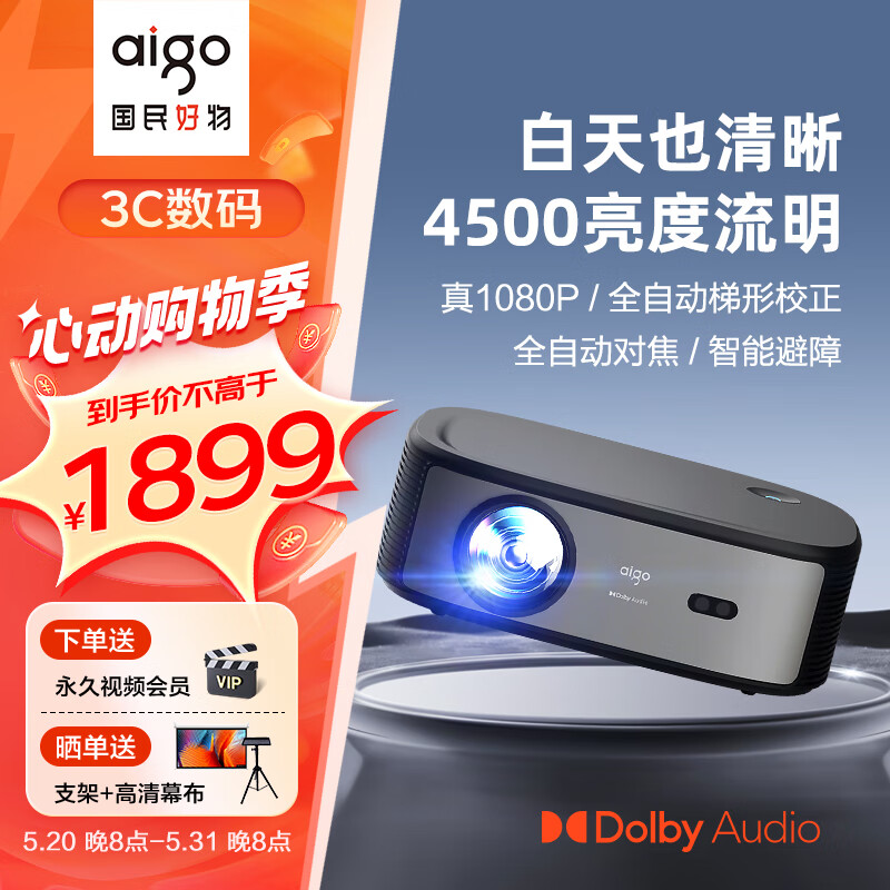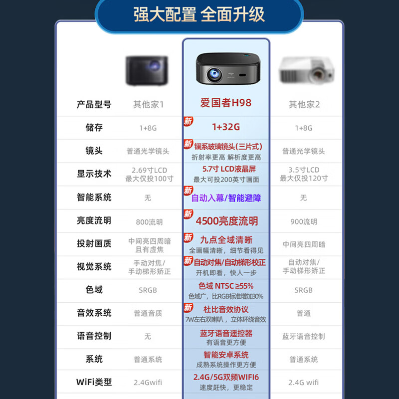 爱国者H98 投影仪家用超高清白天办公会议投影机卧室家庭影院(4500亮度流明 自动对焦 自动梯形校正)价格:2249.00元!