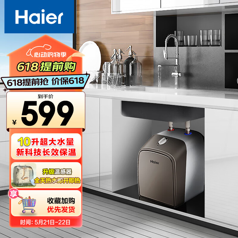 海尔(Haier)10升大水量上出水小厨宝电热水器 储水式家用厨房热水宝 2000W速热节能保温小尺寸 台下安装 ES10U价格:597.00元!
