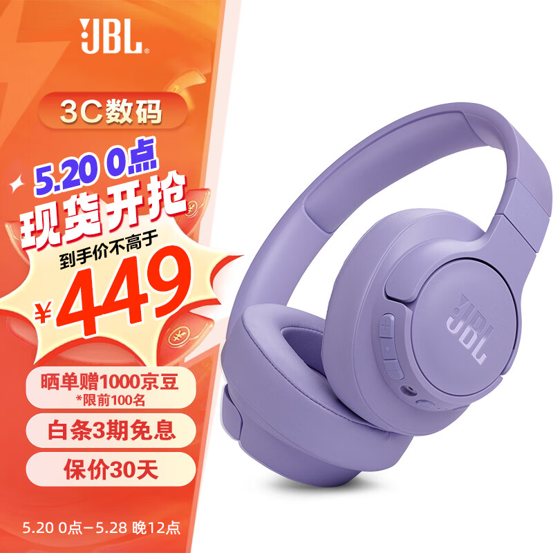 JBL T770NC无线蓝牙降噪耳机 头戴式主动降噪游戏耳机 70小时续航 青黛紫价格:449.00元!