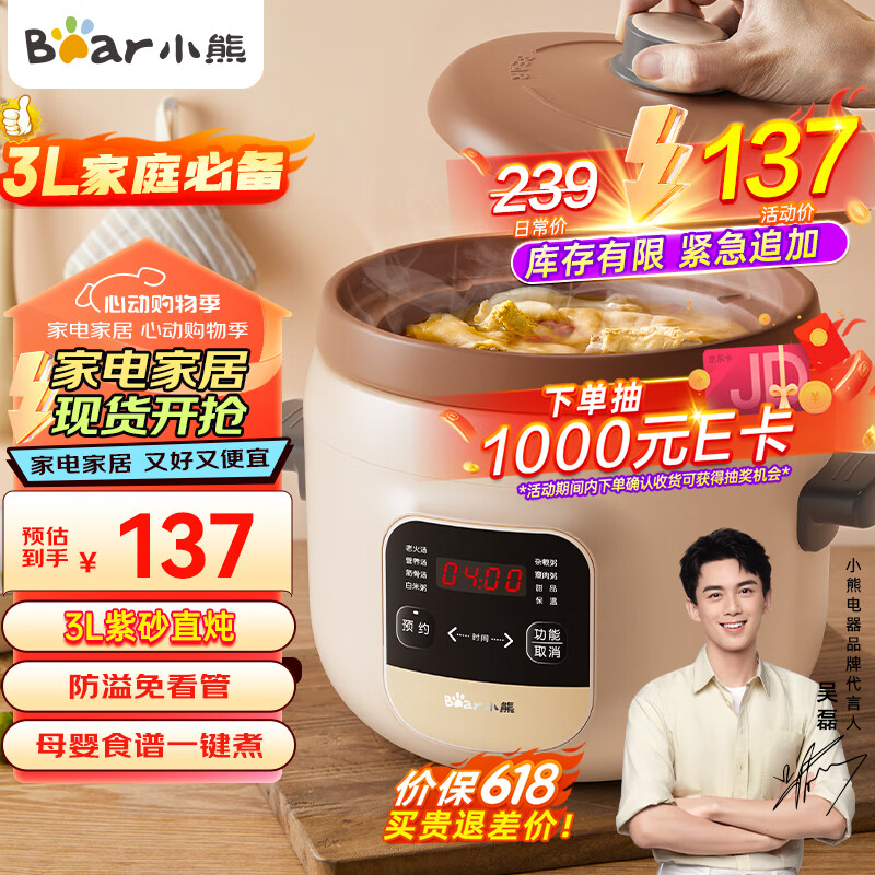 小熊(Bear)电炖锅 电砂锅 电炖盅 煲汤锅 炖汤锅 煮粥锅 紫砂锅 预约定时婴儿辅食燕窝3L电汤锅DDG-D30L3价格:137.00元!