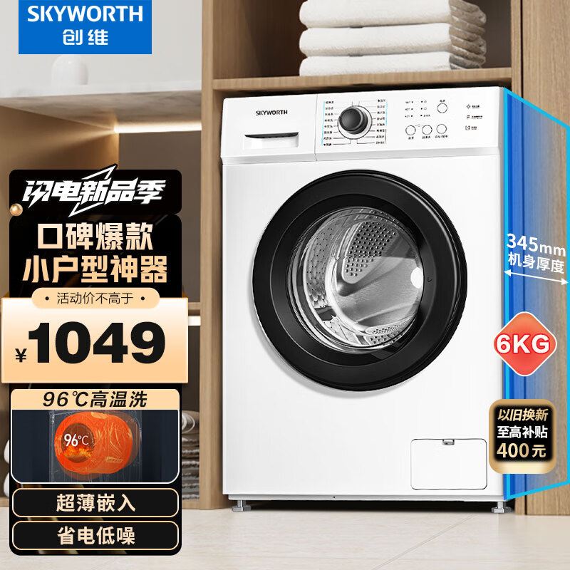 创维(SKYWORTH)6公斤 滚筒洗衣机全自动 宿舍租户小型迷你便捷 超薄嵌入 96℃高温洗家用洗衣机公寓价格:1049.00元!