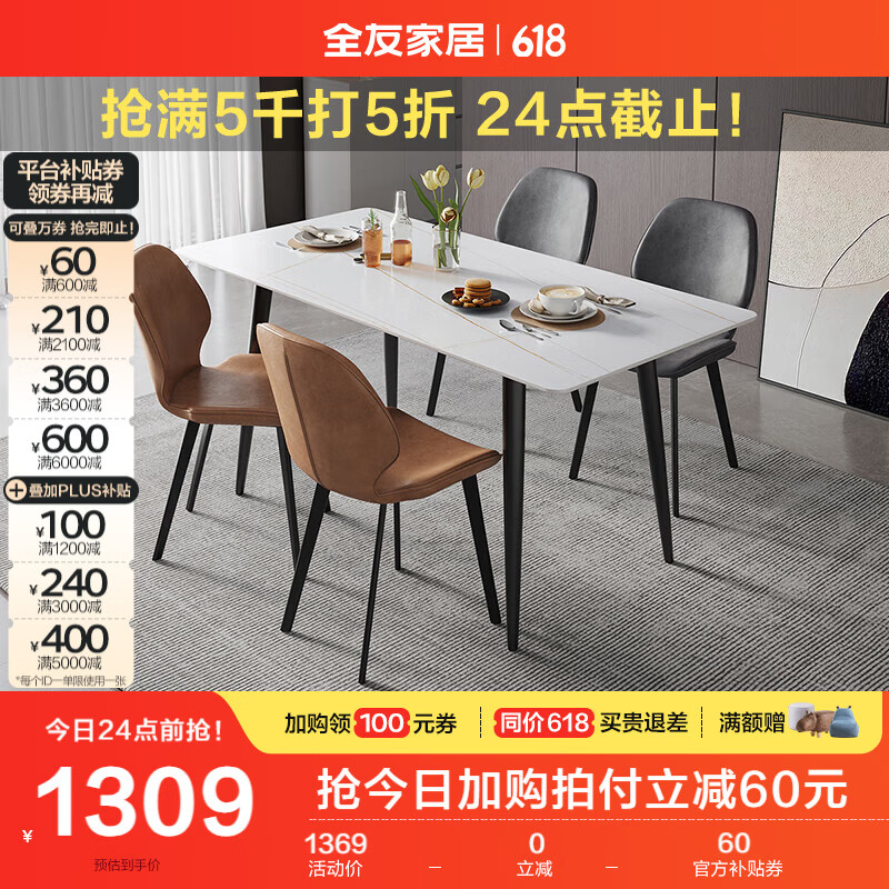 全友家居岩板餐桌家用轻奢现代简约餐桌椅饭桌小户型餐桌价格:1369.00元!