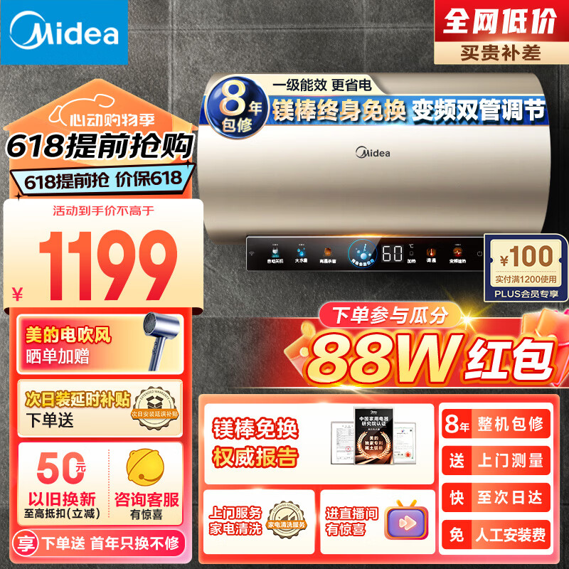 美的(Midea)终身免换镁棒60升电热水器家用储水式3300W/2300W速热变频省电一级能效低耗节能F6033-JE6(HE)价格:1299.00元!