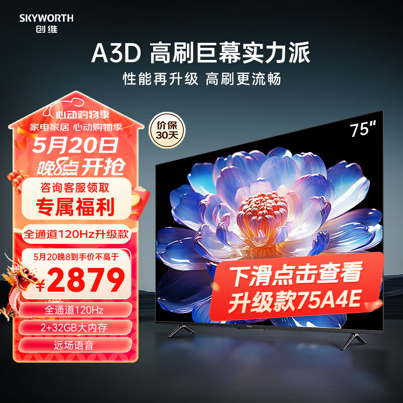 创维电视75A3D 75英寸120Hz高刷 2+32GB远场语音 4K高清智慧屏超薄液晶平板电视机 以旧换新75M3D 75英寸价格:2979.00元!