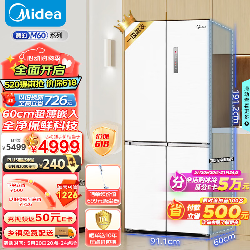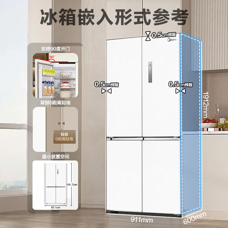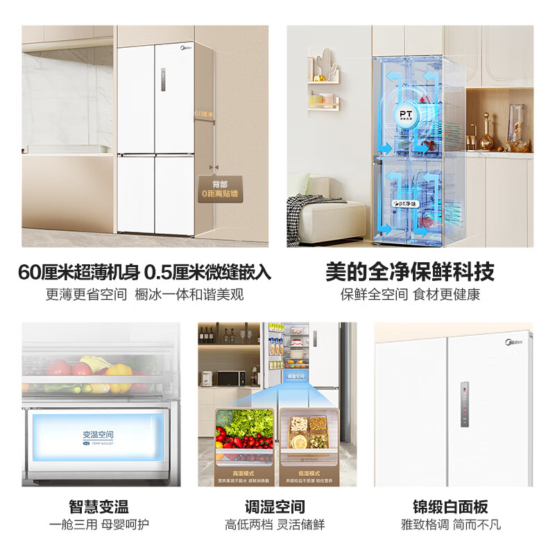 美的(Midea)M60系列60cm薄567超薄嵌平嵌十字双开四开门一级大容量风冷无霜家用智能电冰箱MR-567WUSPZE大白豚价格:5499.00元!