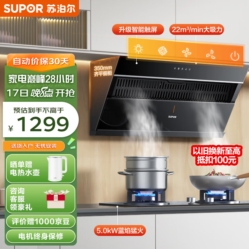 苏泊尔(SUPOR)抽油烟机侧吸式?爆炒22立方大吸力?家用吸油烟机?450pa强劲风压油烟机燃气灶套装?DJ11+DB19S天价格:1299.00元!