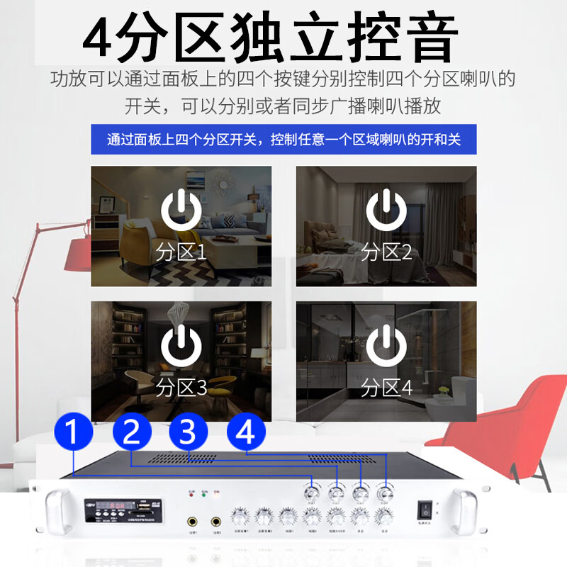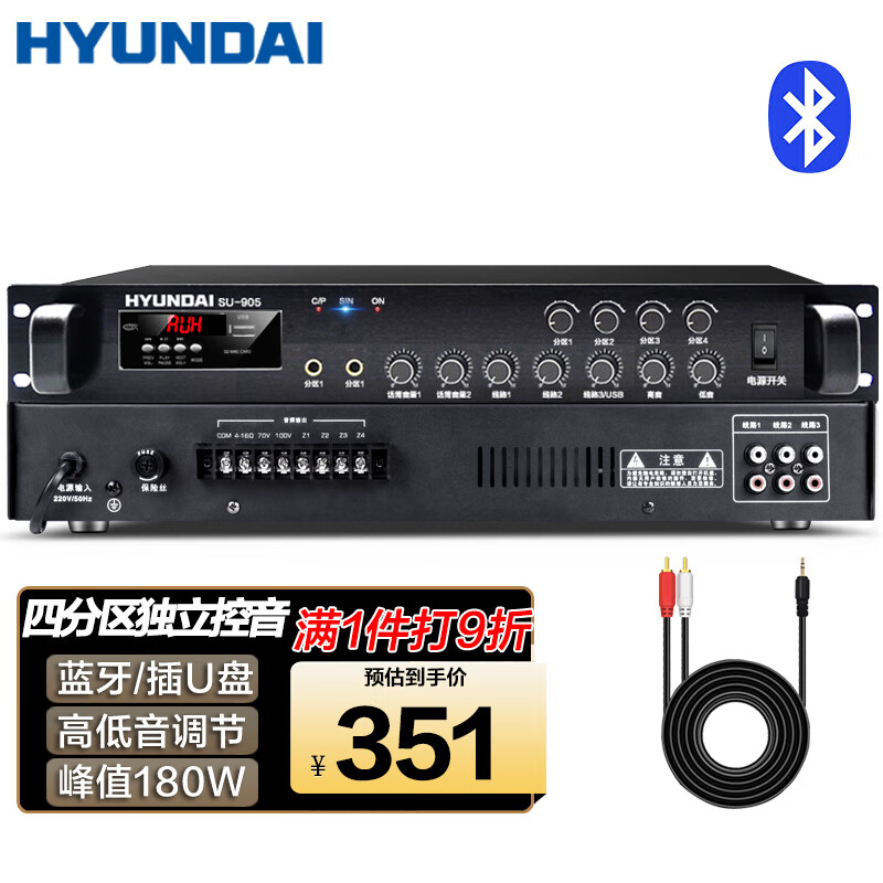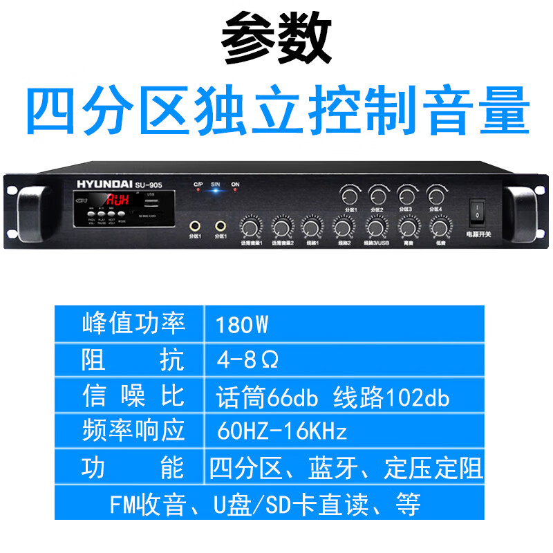 HYUNDAI现代 SU-905定压大功率功放机 蓝牙公共广播吸顶吊顶喇叭壁挂音响家庭影院四分区控音峰值功率180W价格:390.00元!