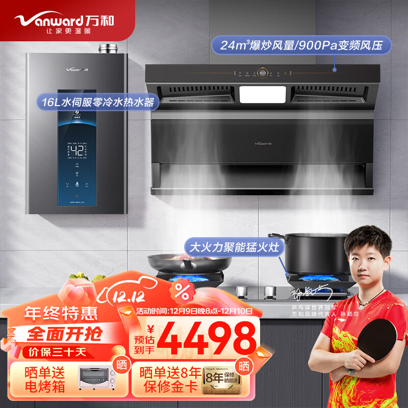 万和(Vanward)烟灶热三件套 三腔7字型大吸力900Pa变频油烟机燃气灶热水器 WL860+C5L90S+MLS5D16(天然气)价格:4498.00元!