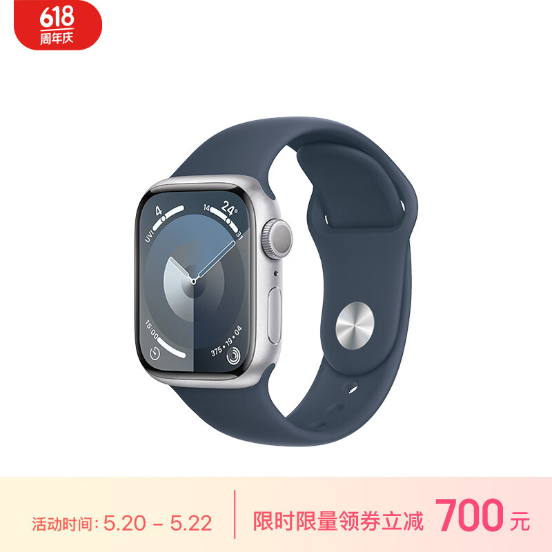Apple/苹果 Watch Series 9 智能手表GPS款41毫米银色铝金属表壳 风暴蓝色运动型表带S/M MR903CH/A价格:2999.00元!