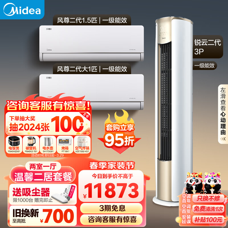 美的(Midea)空调 风尊系列 温馨二居套餐 两室一厅套装(1.5匹风尊二代+大1匹风尊二代+3匹锐云柜机)价格:12497.00元!