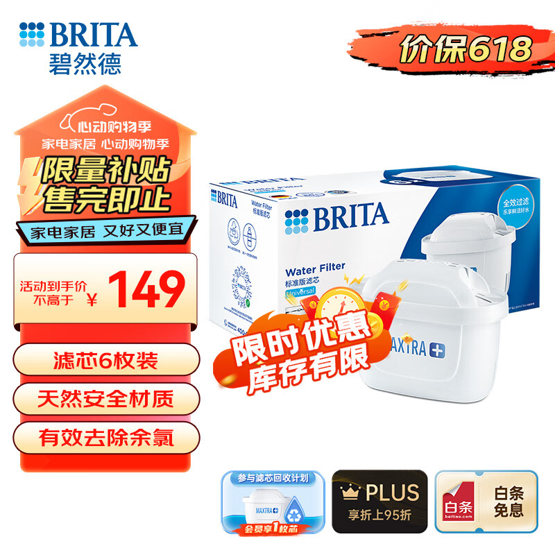 碧然德(BRITA) 家用滤水壶 净水壶滤芯 Maxtra 多效滤芯 6枚装价格:149.00元!