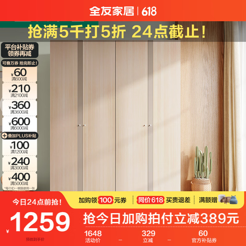 全友家居 衣柜现代简约平开门衣柜北欧卧室四门衣柜106305 四门衣柜价格:1648.75元!