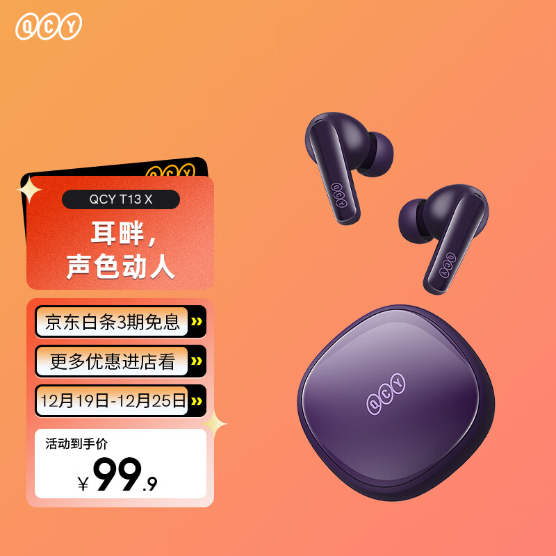QCY T13 X 2023款真无线蓝牙耳机 运动耳麦抗风噪四麦通话降噪耳机快充 全手机通用 紫色价格:99.90元!