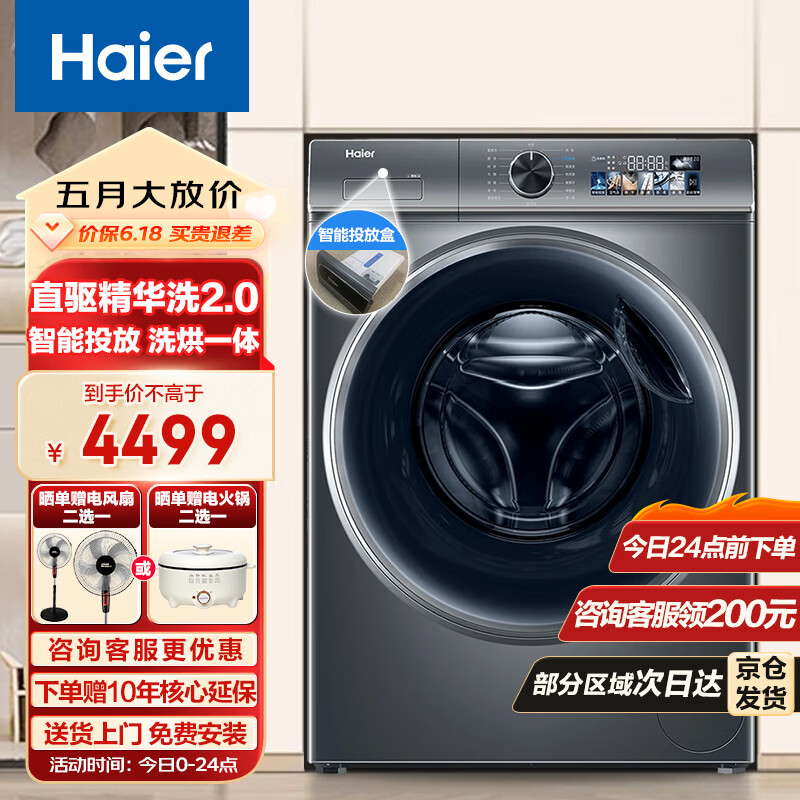 海尔(Haier)【精华洗2.0】10KG直驱变频滚筒洗衣机全自动一级能效智能投放除菌空气洗烘一体机XQG100-HBD1266价格:4499.00元!