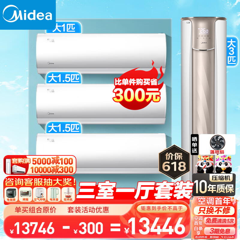 美的(Midea)空调套装三室一厅套餐一套购齐 新一级能效变频挂机柜机 3匹锐静+风酷/极酷/冷静星/酷省电/青春价格:13746.00元!
