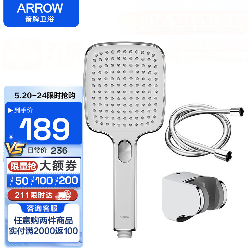 箭牌(ARROW)手持花洒套装增压宽屏超大加厚面板淋浴手持莲蓬头花洒喷头 增压加厚手持套装(方形)价格:236.25元!