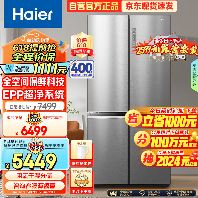 海尔(Haier)657升全空间保鲜十字双开四开门家用电冰箱一级能效变频无霜大容量以旧换新BCD-657WGHTD19S7U1价格:7499.00元!