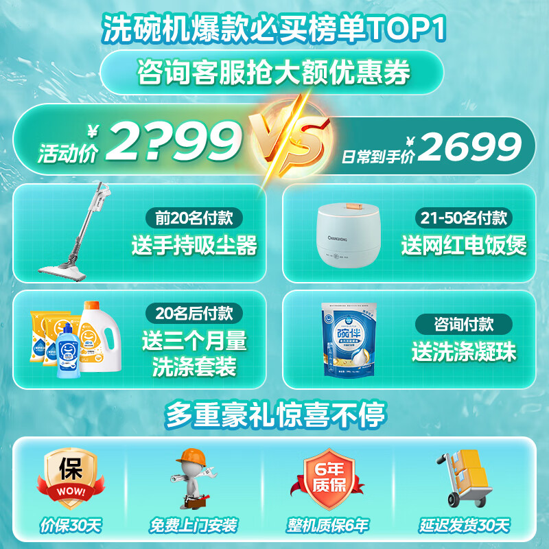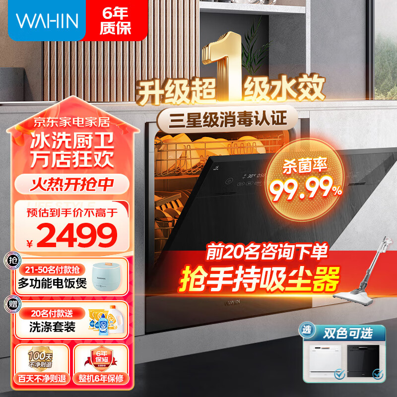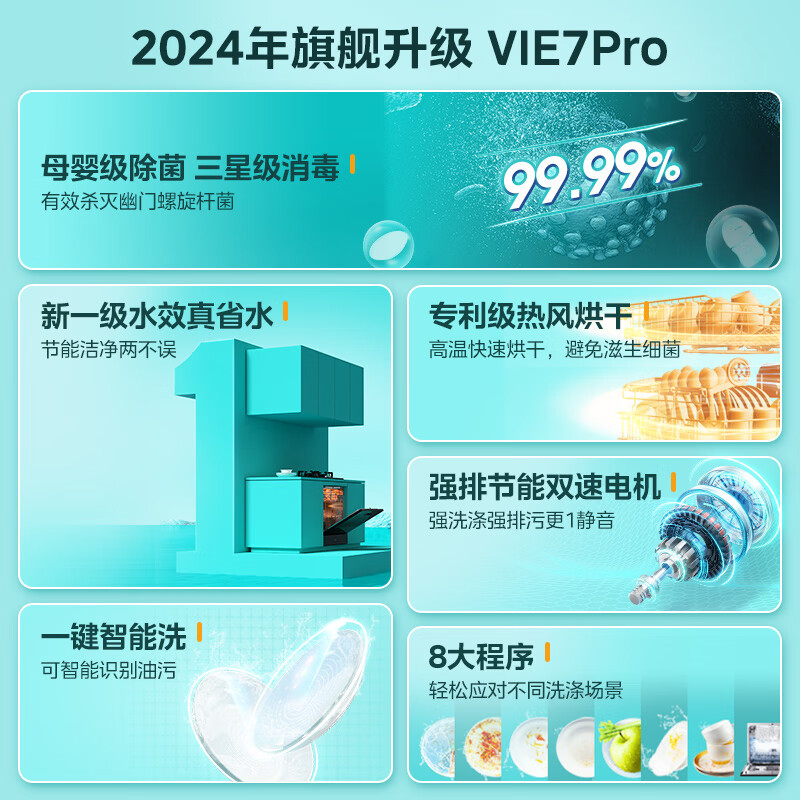 华凌10套洗碗机vie7家用嵌入式全自动台式 热风烘干除菌率99.99% 自清洁洗碗机23年升级版 【一级水效三星消毒】24年新升级vie7pro价格:2699.00元!