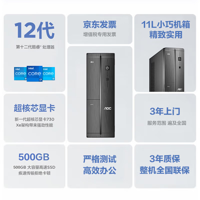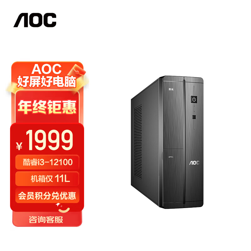 AOC 荣光910 高性能商用办公台式机电脑主机(12代i3-12100 16G 500G SSD WIFI商务键鼠 三年上门)价格:1999.00元!