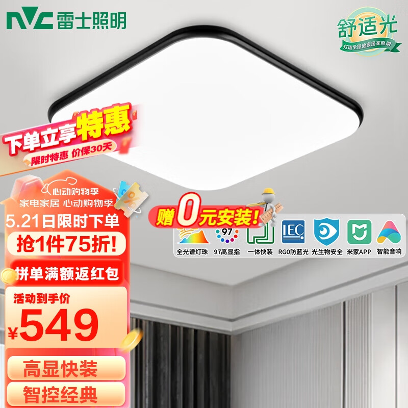 雷士(NVC)LED吸顶灯现代简约卧室书房餐厅灯具全光谱语音智控小白方形灯饰价格:732.00元!
