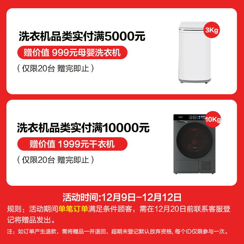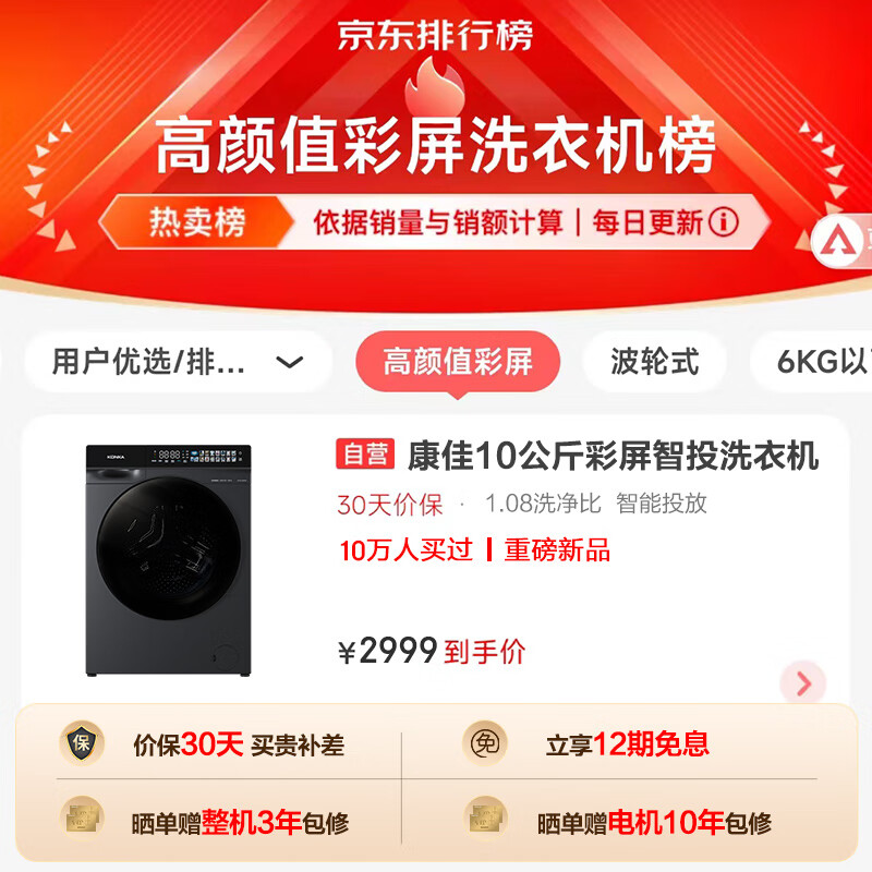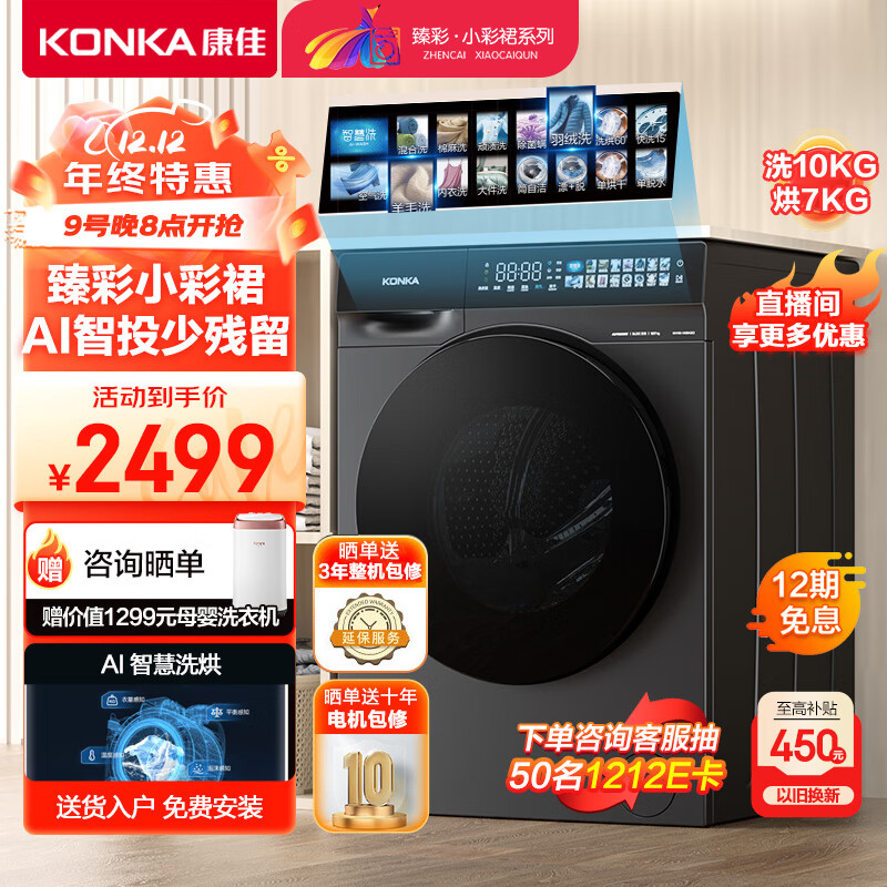 康佳(KONKA)滚筒洗衣机全自动 臻彩系列小彩裙 10KG洗烘一体 巴氏除菌 智能投放 1.08洗净比 KH100-X1408AQIT价格:2999.00元!