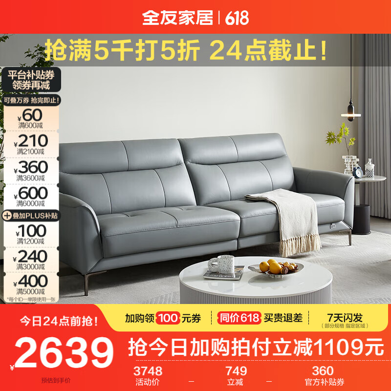 全友家居 真皮沙发 现代简约小户型双人轻奢风直排皮艺沙发客厅102710价格:3748.75元!