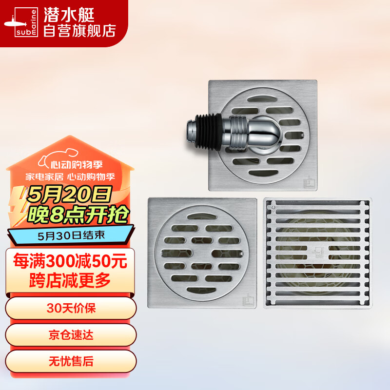 潜水艇(Submarine)不锈钢拉丝防臭地漏套装50管径1个淋浴+1个干湿区+1个洗衣机地漏价格:234.00元!
