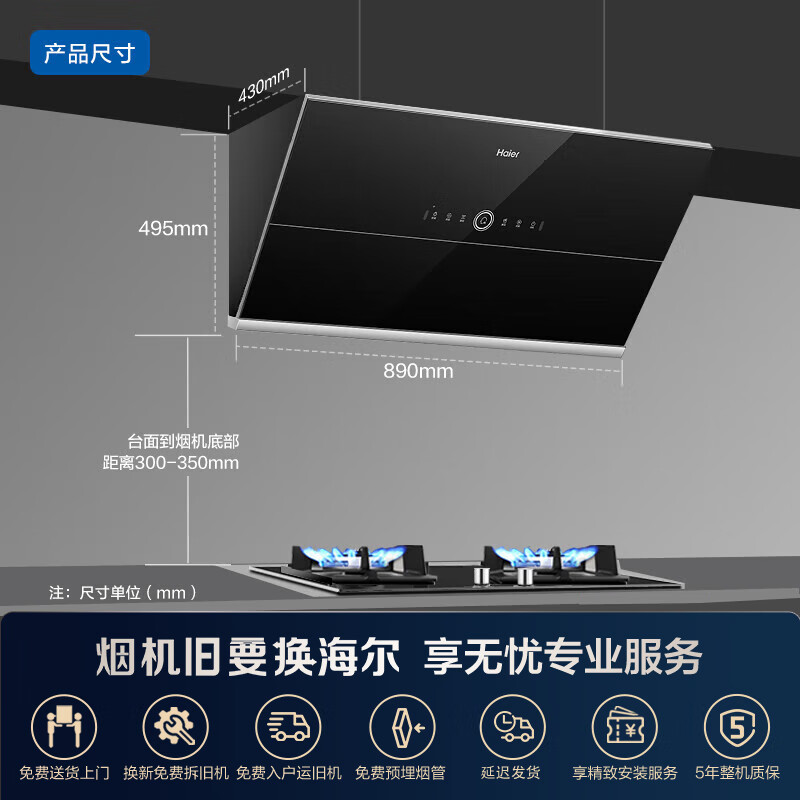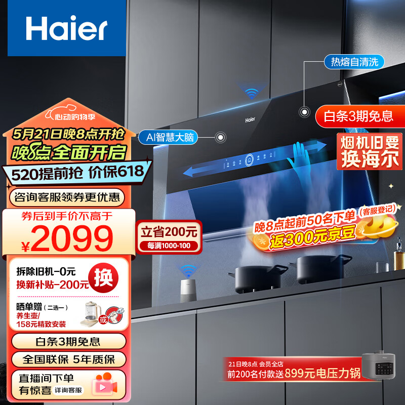 海尔(Haier)抽油烟机 侧吸式吸烟机 变频26立方大吸力 挥手智控 自动清洗 家用厨房排烟机EC911UD价格:2299.00元!