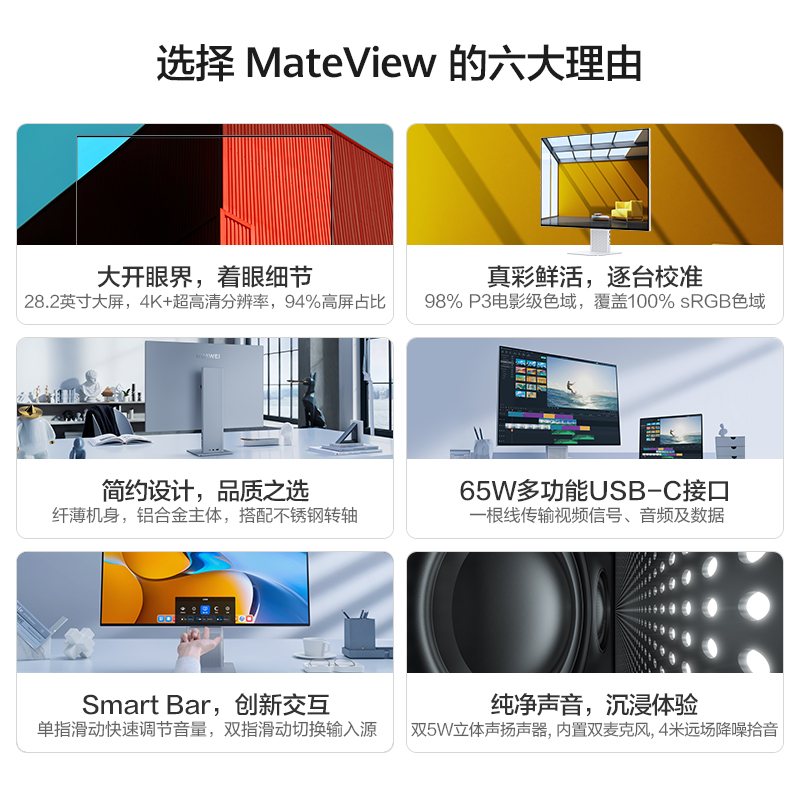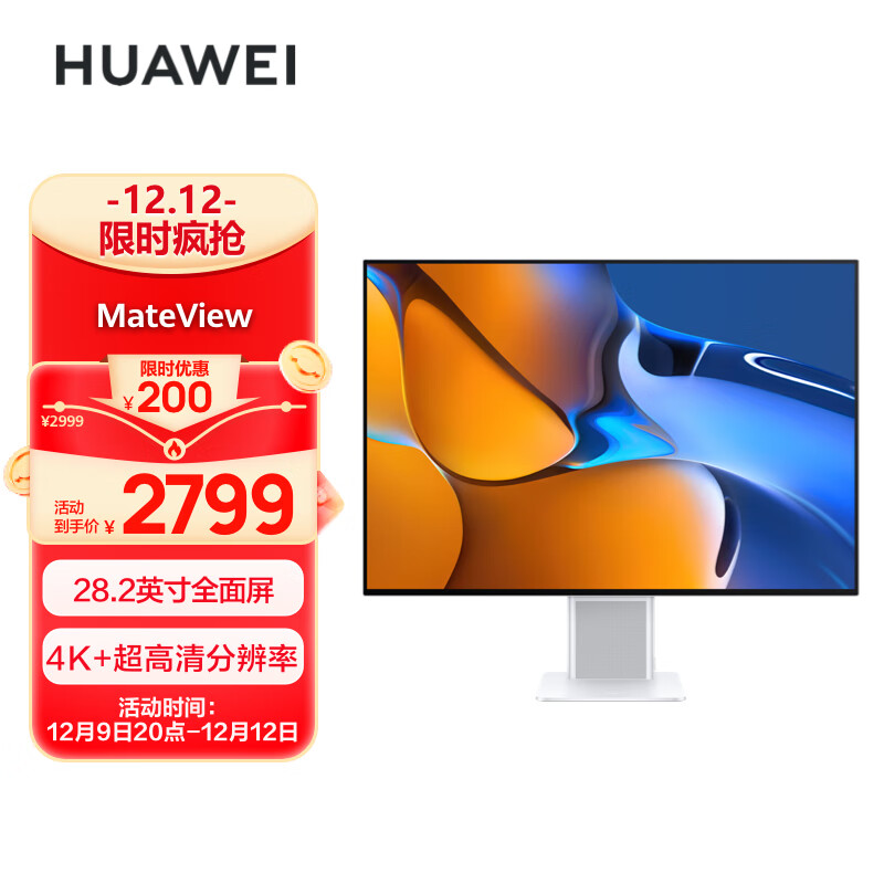 华为HUAWEI MateView显示器28.2英寸 4K+ IPS 98% P3色域 HDR400 TypeC 65W 内置音箱 低蓝光无频闪 电脑办公价格:2799.00元!