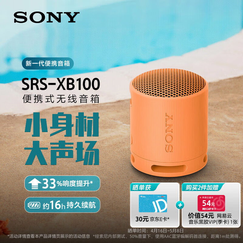 索尼(SONY)SRS-XB100 蓝牙音箱 迷你便携 重低音16小时续航 户外音箱 IP67防水防尘 橙色价格:399.00元!