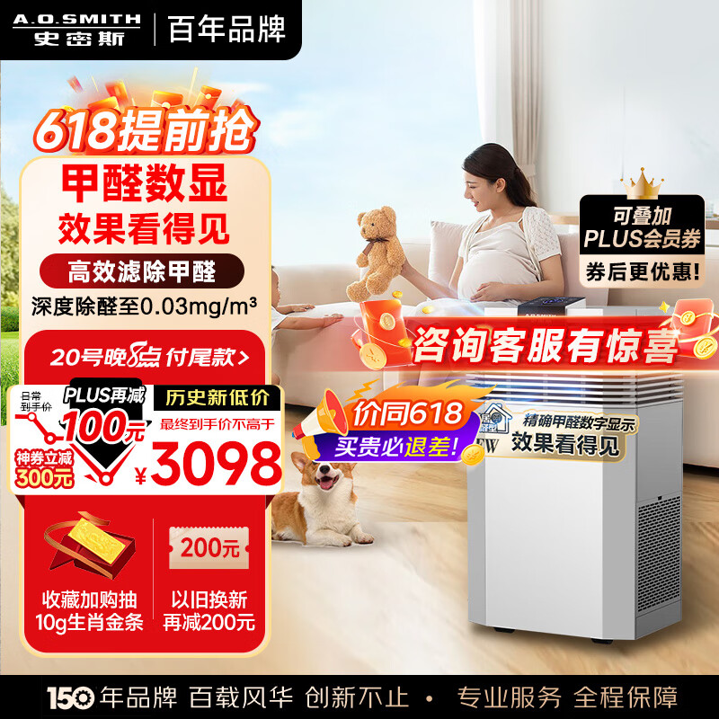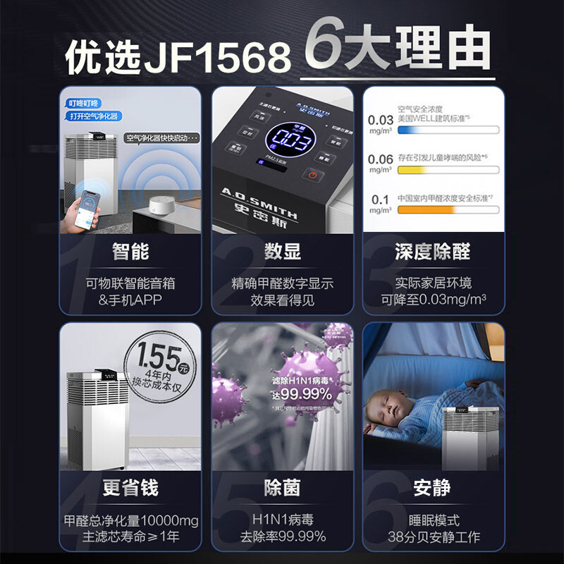 史密斯(A.O.SMITH)除甲醛空气净化器家用 分解除醛除菌除异味PM2.5除过敏原雾霾 JF1568 卧室优选 【京东小家智能】价格:3498.00元!