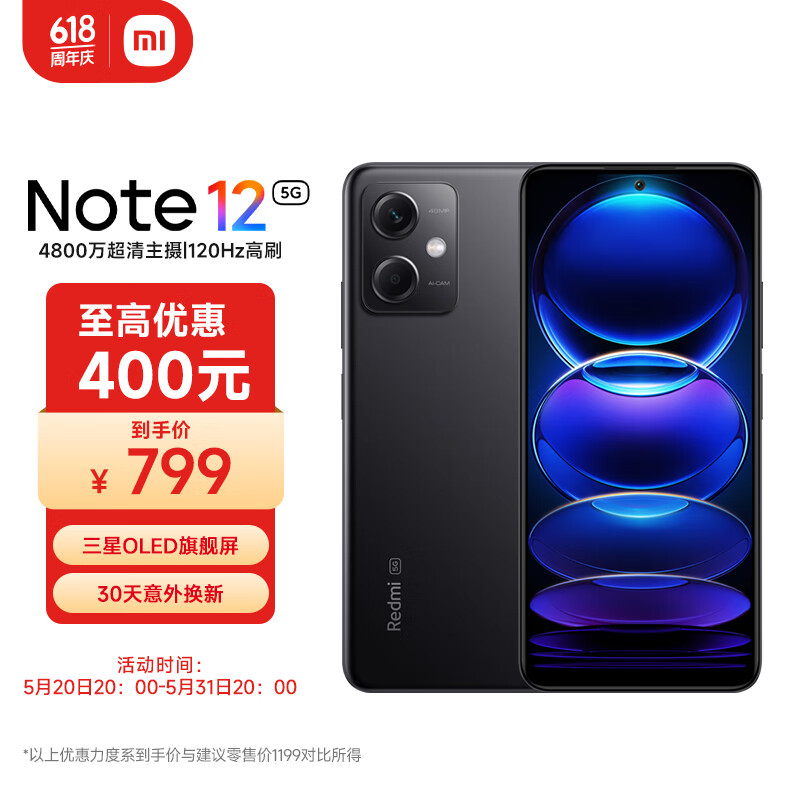 小米(MI)Redmi Note12 5G 120Hz OLED屏幕 骁龙4移动平台 5000mAh长续航 8GB+128GB子夜黑 小米红米价格:799.00元!