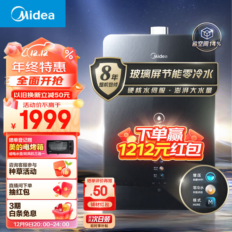 美的(Midea)16升燃气热水器 天然气 水伺服恒温 双增压零冷水 半管节能 多重防冻 多重安防 彩晶屏 JSQ30-RS8价格:1999.00元!