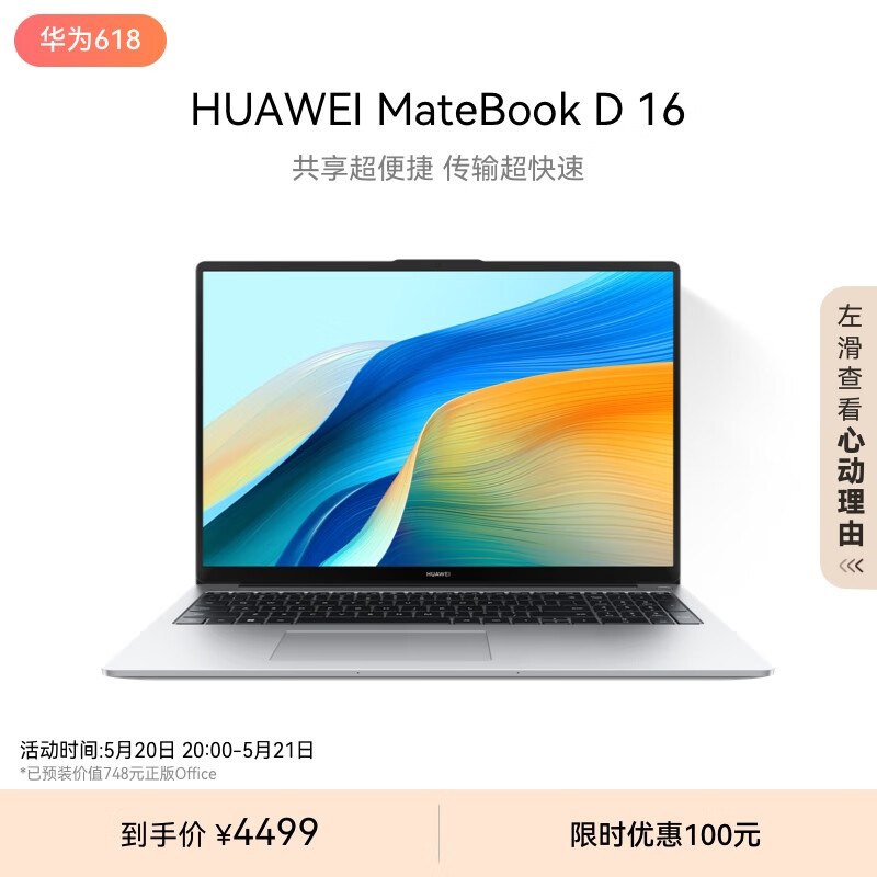 华为MateBook D 16 2024笔记本电脑 13代酷睿标压处理器/16英寸护眼大屏/轻薄办公本 i5 16G 1T 皓月银价格:4499.00元!
