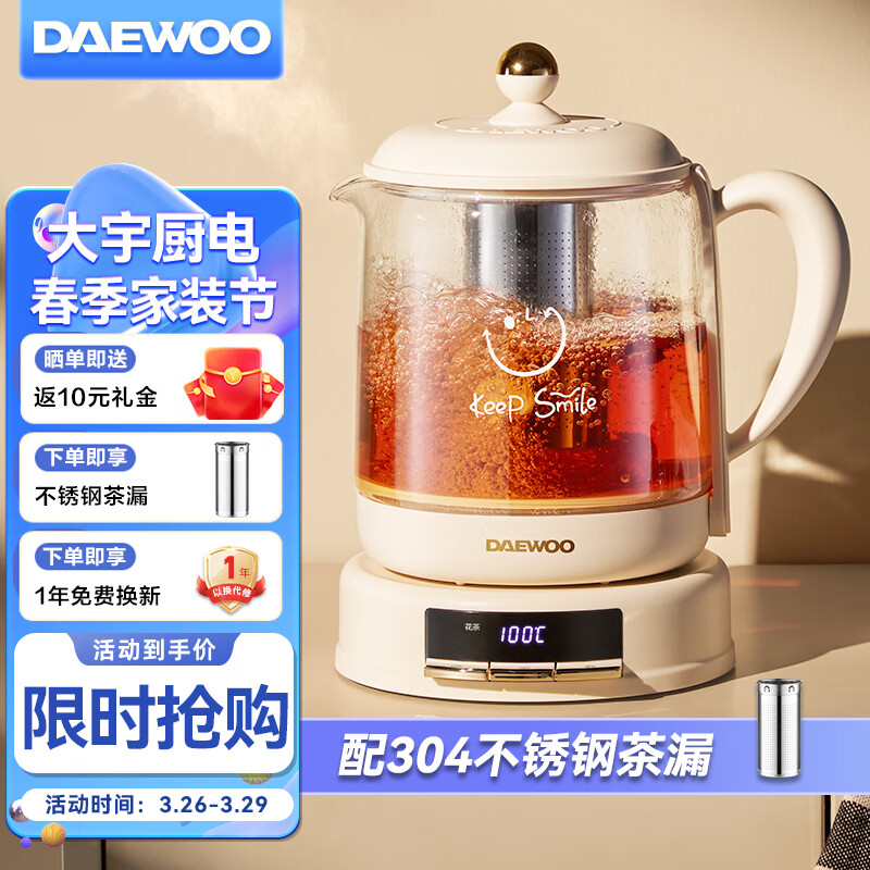 大宇(DAEWOO)小气泡养生壶 煮茶器 烧水壶 煮茶壶 多段保温迷你玻璃花茶壶 智能恒温电热水壶1.5L YS11-NTB价格:199.00元!