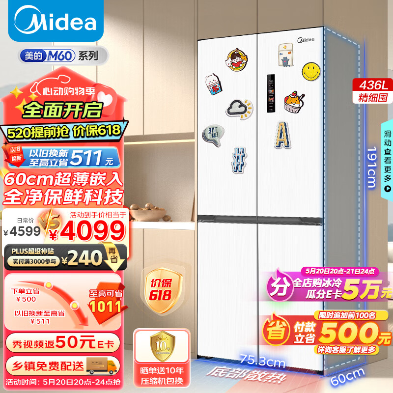 美的(Midea)M60系列60cm薄457平嵌超薄嵌十字双开四开门一级变频风冷无霜家用智能电冰箱MR-457WUSPZE大白豚价格:4499.00元!