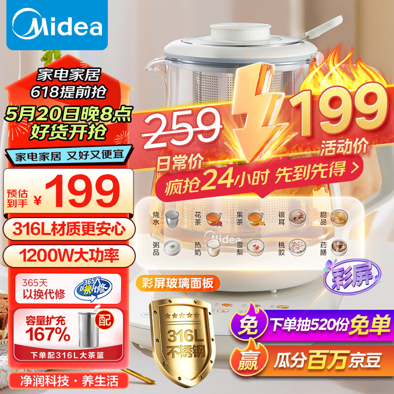 美的(Midea)养生壶 316L不锈钢煮茶壶1.5L烧水壶1200W煮茶器24小时预约12小时恒温11档控温电热水壶彩屏玻璃价格:199.00元!