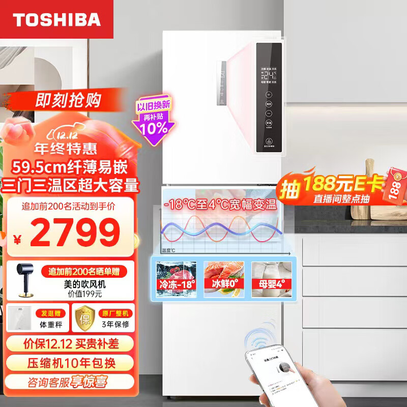 东芝(TOSHIBA)小小白小户型家用高端三门纤薄易嵌电冰箱风冷无霜一级能效低温触媒kang菌祛味GR-RM285WI-PM153价格:2852.00元!