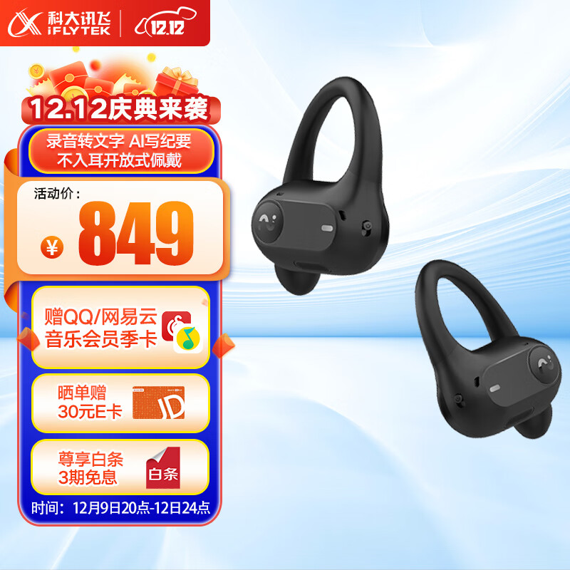 科大讯飞开放式办公耳机 Air 黑 无线蓝牙耳机 骨传导升级气传导运动录音耳机 同传听译 适用苹果华为价格:959.00元!