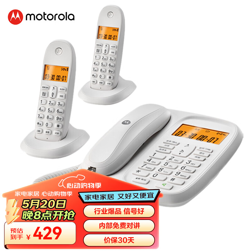 摩托罗拉(Motorola)数字无绳电话机 无线座机 子母机一拖二 办公家用 中文显示 双免提套装CL102C(白色)价格:429.00元!