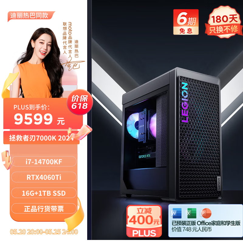联想(Lenovo)拯救者刃7000K 2024游戏电竞电脑主机(酷睿14代i7-14700KF RTX4060Ti 8GB显卡 16G 1T SSD)价格:9999.00元!