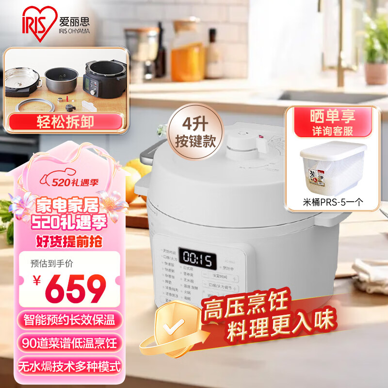 爱丽思(IRIS)电锅智能预约锅高压锅电火锅无水烹饪 4升 按键款白色 90道菜谱 建议3-5人使用价格:659.00元!