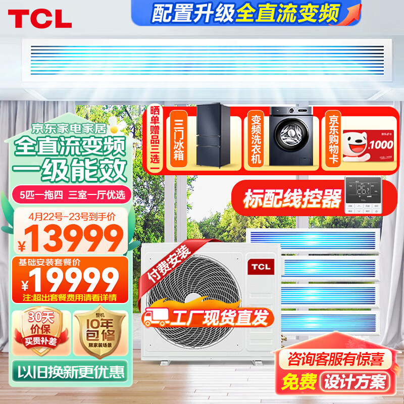 TCL中央空调5匹一拖四家用多联机 新一级能效全直流变频 风管机嵌入式空调 三室一厅 TMV-Vd120W/N1-D价格:15799.00元!