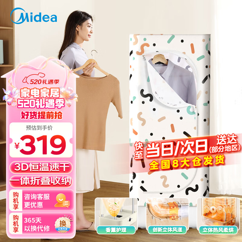 美的(Midea)干衣机 烘干机家用小型 智能恒温速干 香薰除臭祛味 折叠烘鞋器烘衣机 衣物护理机 MHJ70-02L价格:319.00元!