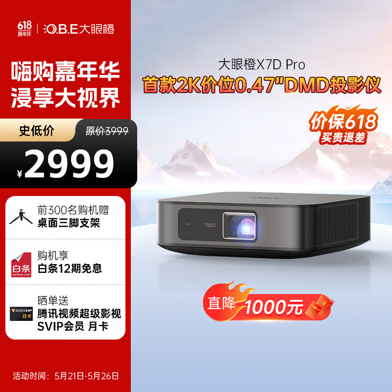 大眼橙【2K+买0.47投影】X7D Pro投影仪家用 投影机家庭影院(2000ANSI高亮 无感自动梯形校正)价格:2999.00元!