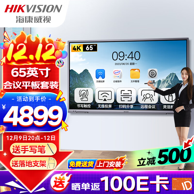 海康威视65英寸会议平板智能视频交互电子白板远程视频教学办公一体机4K超高清触摸智慧屏DS-D5B65RO-C价格:4899.00元!
