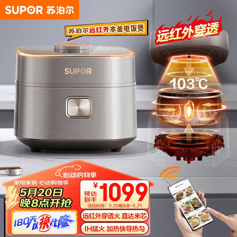 苏泊尔(SUPOR)电饭煲 电饭锅 3L家用多功能大容量远红外穿透加热WIFI+NFC智控IH电磁加热8层本釜内胆 SF30HC85A价格:1049.00元!